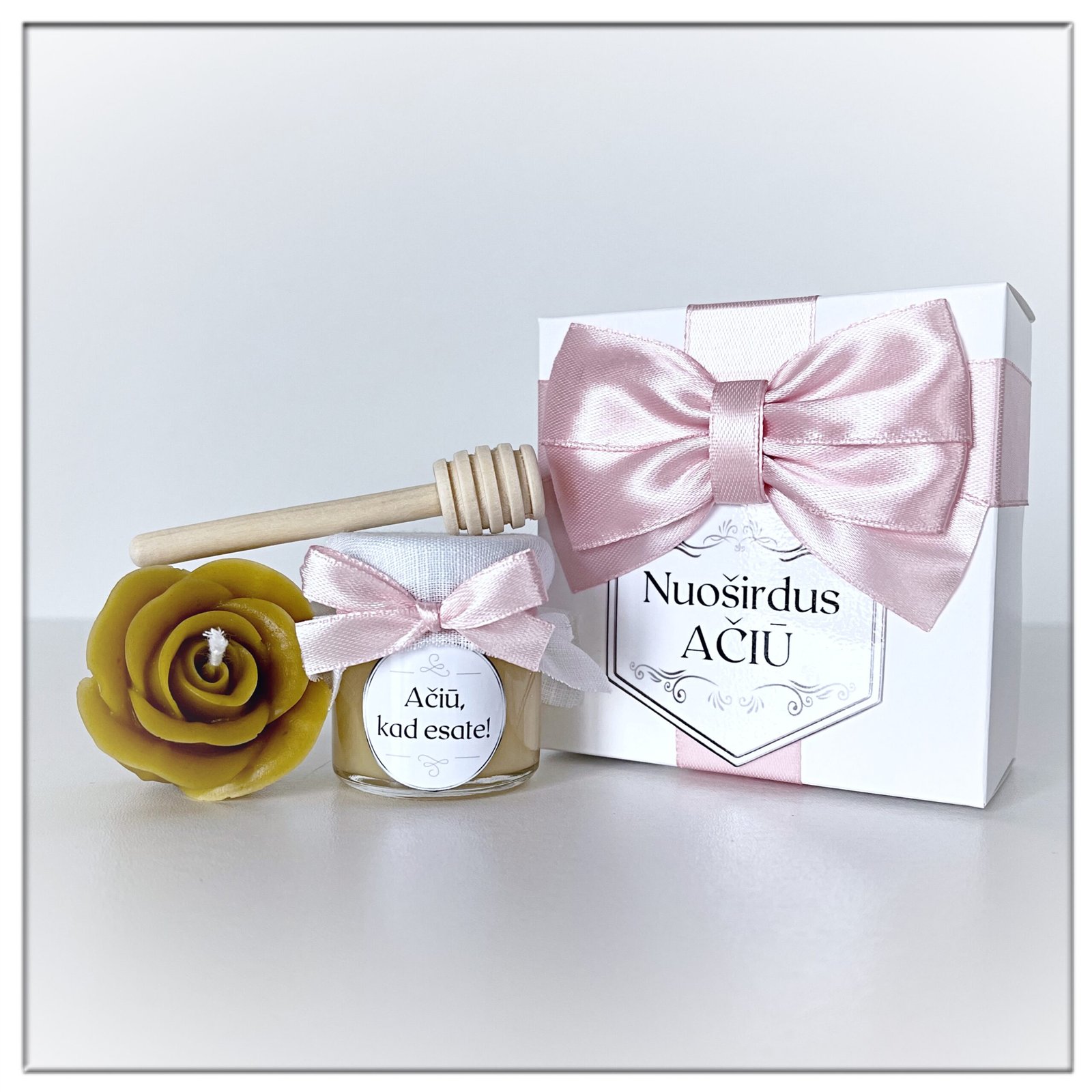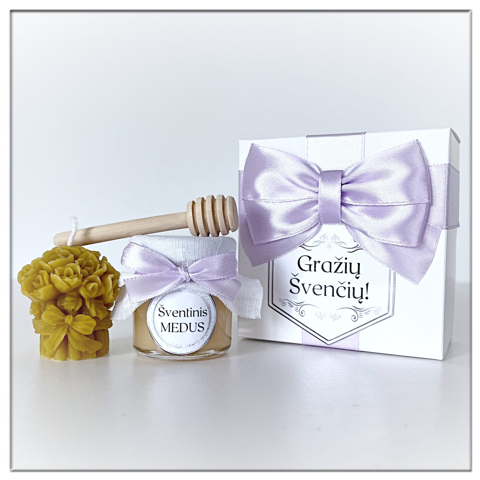 Atminimo dovanėlė – maža dovanėlė šventėms – mini rinkinys. Dėžutėje medaus stiklainis dekoruotas drobele, medinis medaus šaukštelis ir mini natūralaus bičių vaško žvakė. Žvakės formą pasirenkate pirkimo metu. Mini dovanėlės visoms progoms pasveikinti ar padėkoti.
