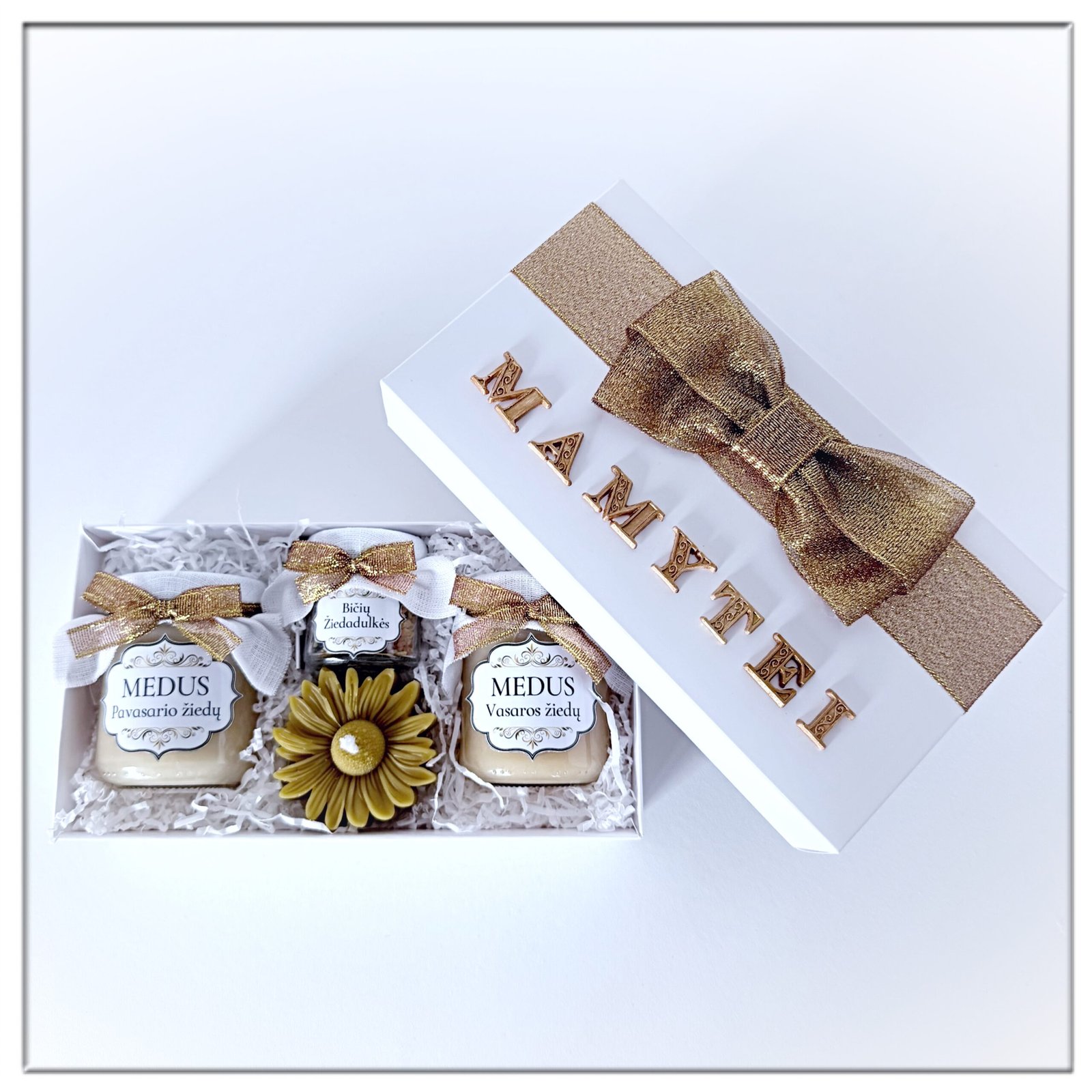 Dovana mamai – medaus dovanų rinkinys dėžutėje su lipdytų raidžių užrašu „Mamytei“. Taip pat galite pasirinkti kitus siūlomus tekstus.