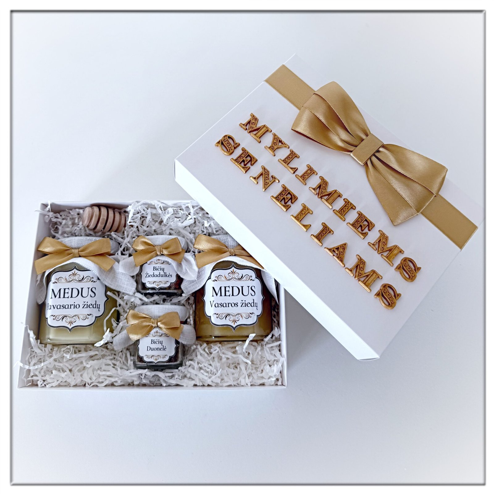 Dovana seneliams – Dovanų rinkinys – dovana seneliui – dovana močiutei. Bičių produktų rinkinys. Rinkinys baltoje dėžutėje, dėžutės dangtelis dekoruotas lipdytų raidžių užrašu „MYLIMAM SENELIUI”,„MYLIMAI MOČIUTEI”, „MYLIMAI BABYTEI” arba „MYLIMIEMS SENELIAMS”.