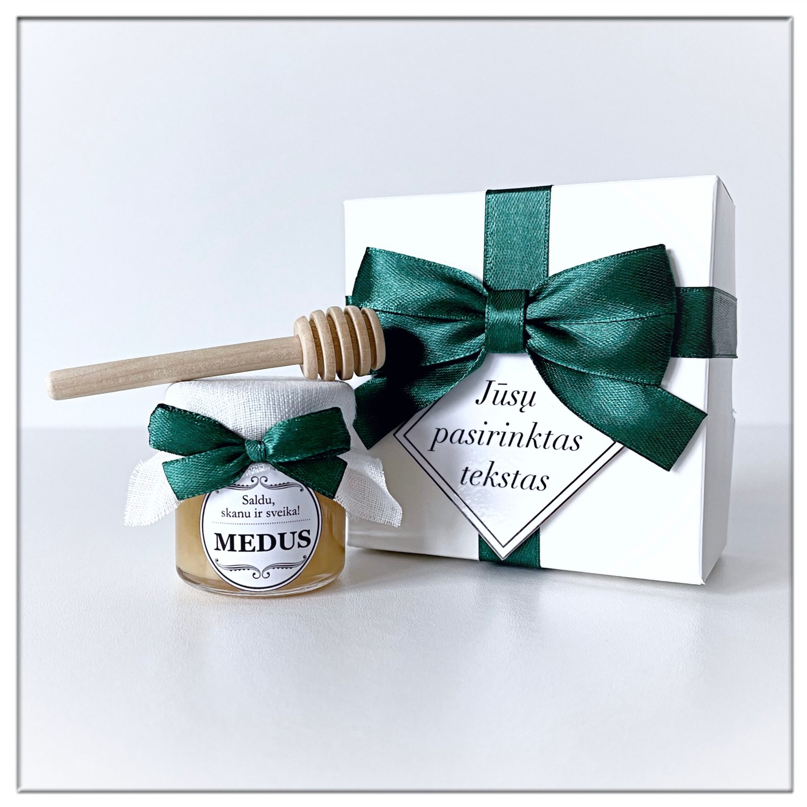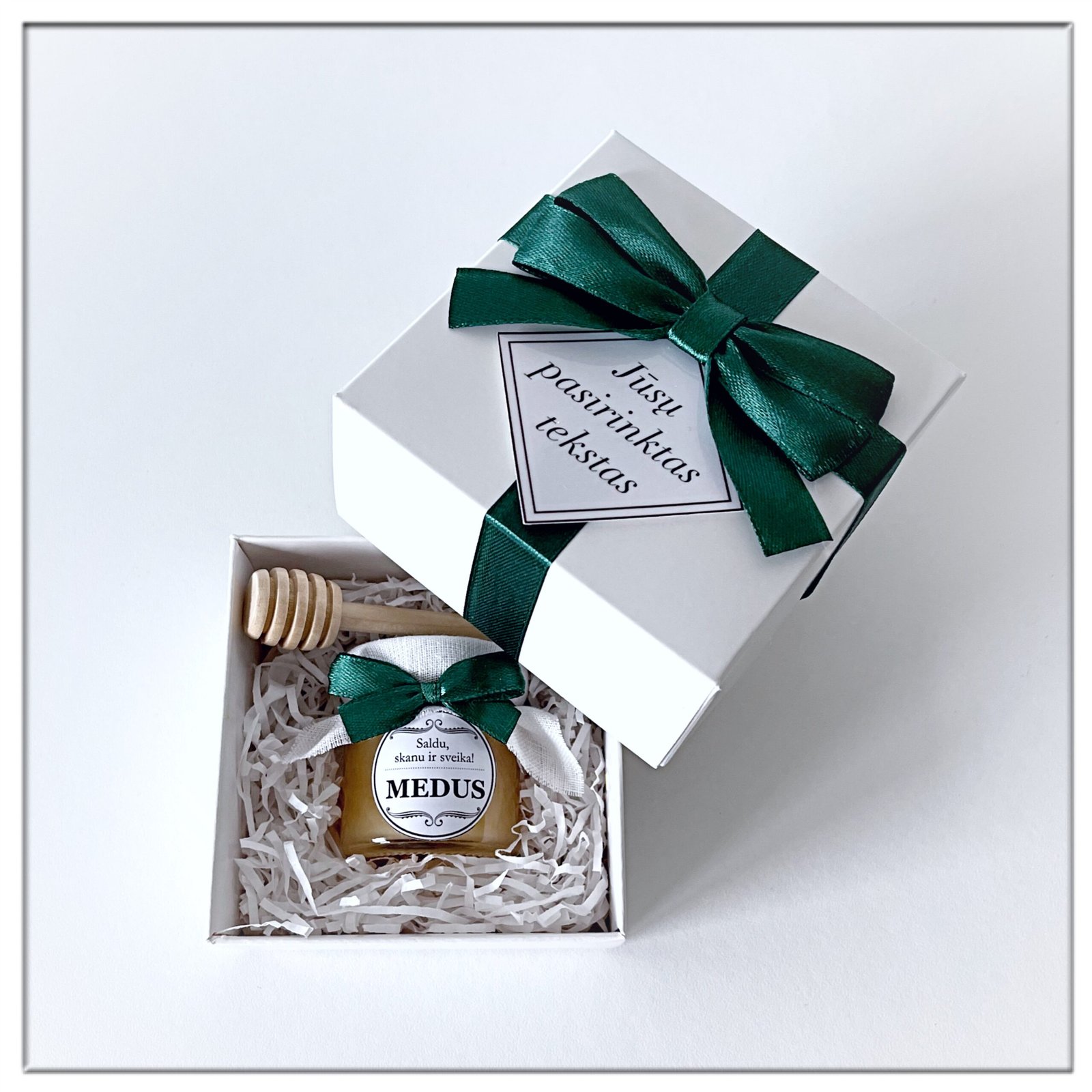 Dovanėlė dėžutėje su kortele/ Vardo kortele – 60g medaus – Mini dovanėlė – Maža dovanėlė šventėms . Dėžutės dangtelis dekoruotas kaspinėliu ir pasveikinimo, padėkos arba vardo kortele. Galite pasirinkti mūsų rekomenduojamus tekstus ar individualius. Galite pasirinkti dėžutės komplektaciją. Užsakymo pastabose nurodykite tekstus.