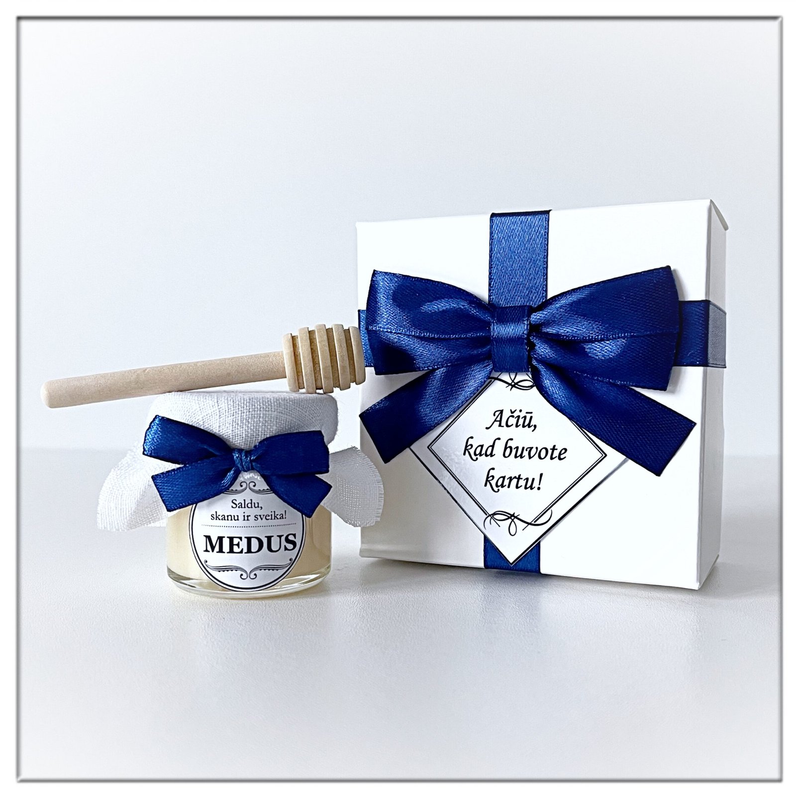 Dovanėlė dėžutėje su kortele/ Vardo kortele – 60g medaus – Mini dovanėlė – Maža dovanėlė šventėms . Dėžutės dangtelis dekoruotas kaspinėliu ir pasveikinimo, padėkos arba vardo kortele. Galite pasirinkti mūsų rekomenduojamus tekstus ar individualius.