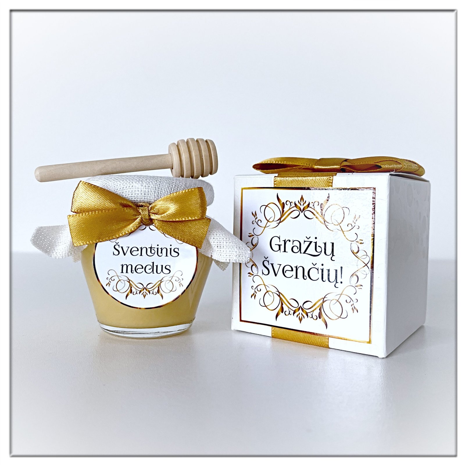 Kalėdinė medaus dovanėlė “Gražių švenčių”. Dekoruota medaus dovanėlė Kalėdoms. Simbolinė dovana Kalėdų proga darbuotojams, bendradarbiams, draugams ir artimiesiems. Medaus dovana dėžutėje, Dėžutė dekoruota kaspinėliu ir lipduku su pasveikinimo tekstu.