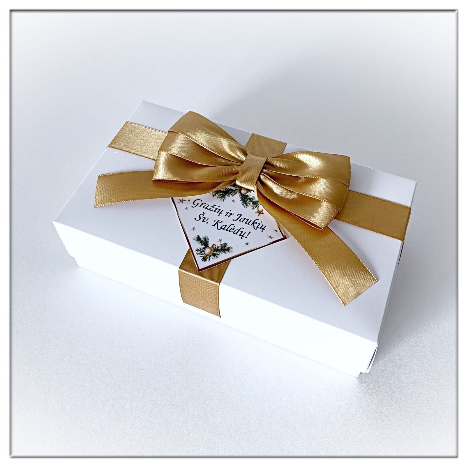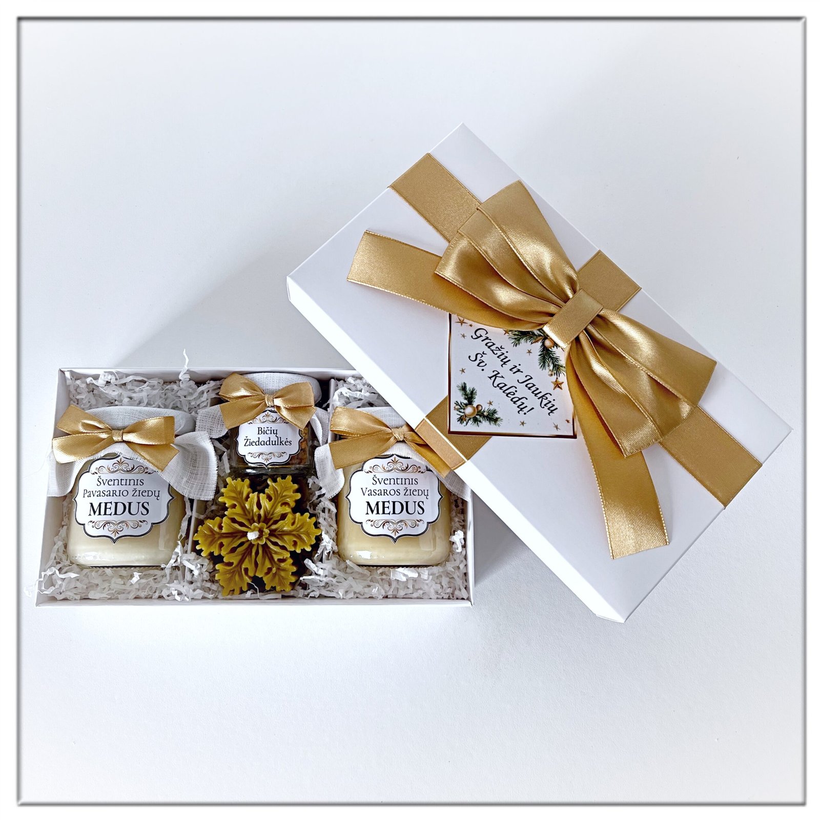 Saldi dovana šventėms – rinkinys. Kalėdinė dovana – medaus dovanų rinkinys Kalėdoms. Dovanos tėvams, draugams, kolegoms Kalėdų proga. Dėžutės dangtelis dekoruotas kaspinu ir pasveikinimo kortele su tekstu.