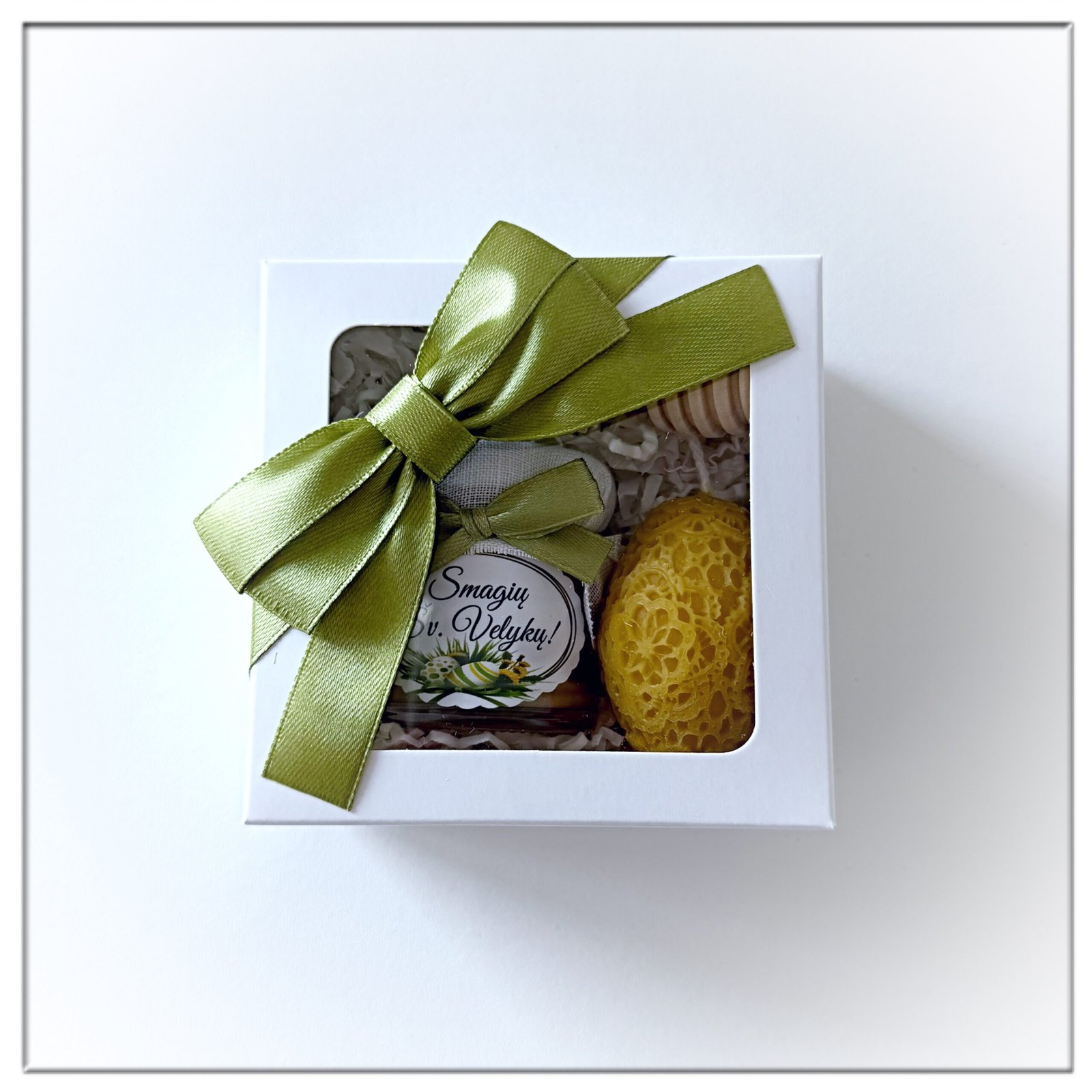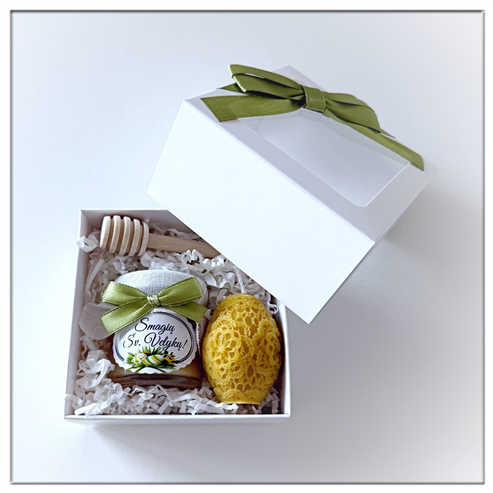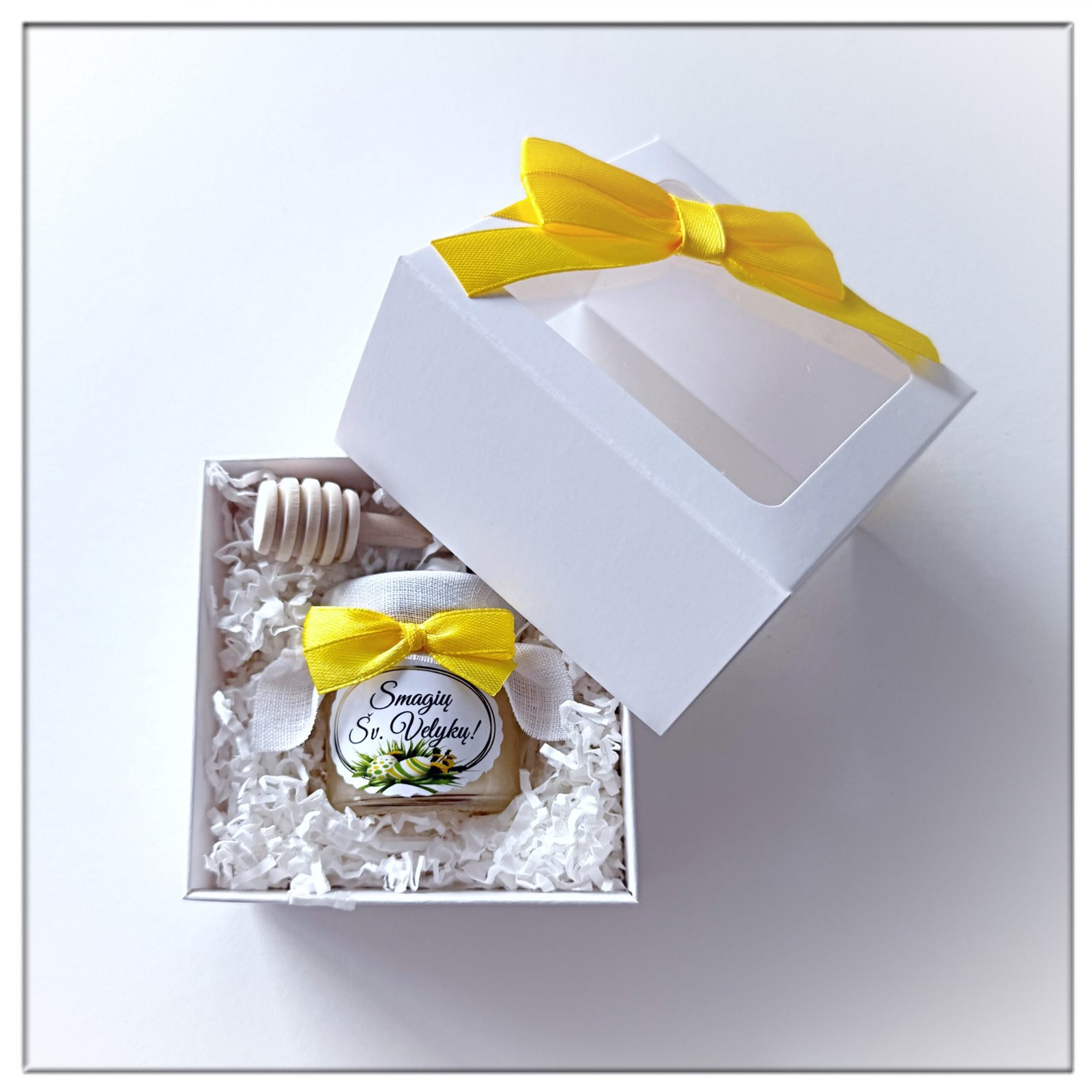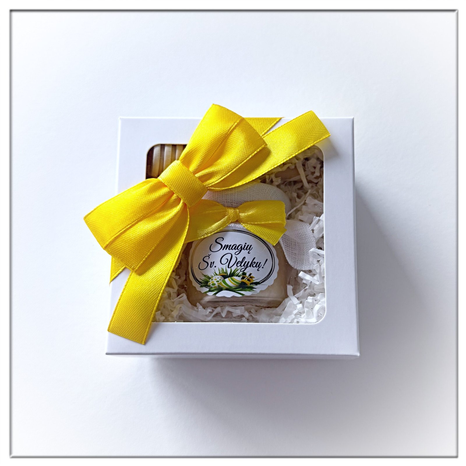 Velykinės dovanos – dovanėlės VELYKOMS. Lauktuvės Velykų proga – Simbolinė medaus dovanėlė gražiausiai pavasario šventei pradžiugins artimuosius ir draugus – Mini rinkinys dekoruotoje dėžutėje. Dėžutės dangtelis dekoruotas kaspinėliu. Galite pasirinkti dėžutės komplektaciją.